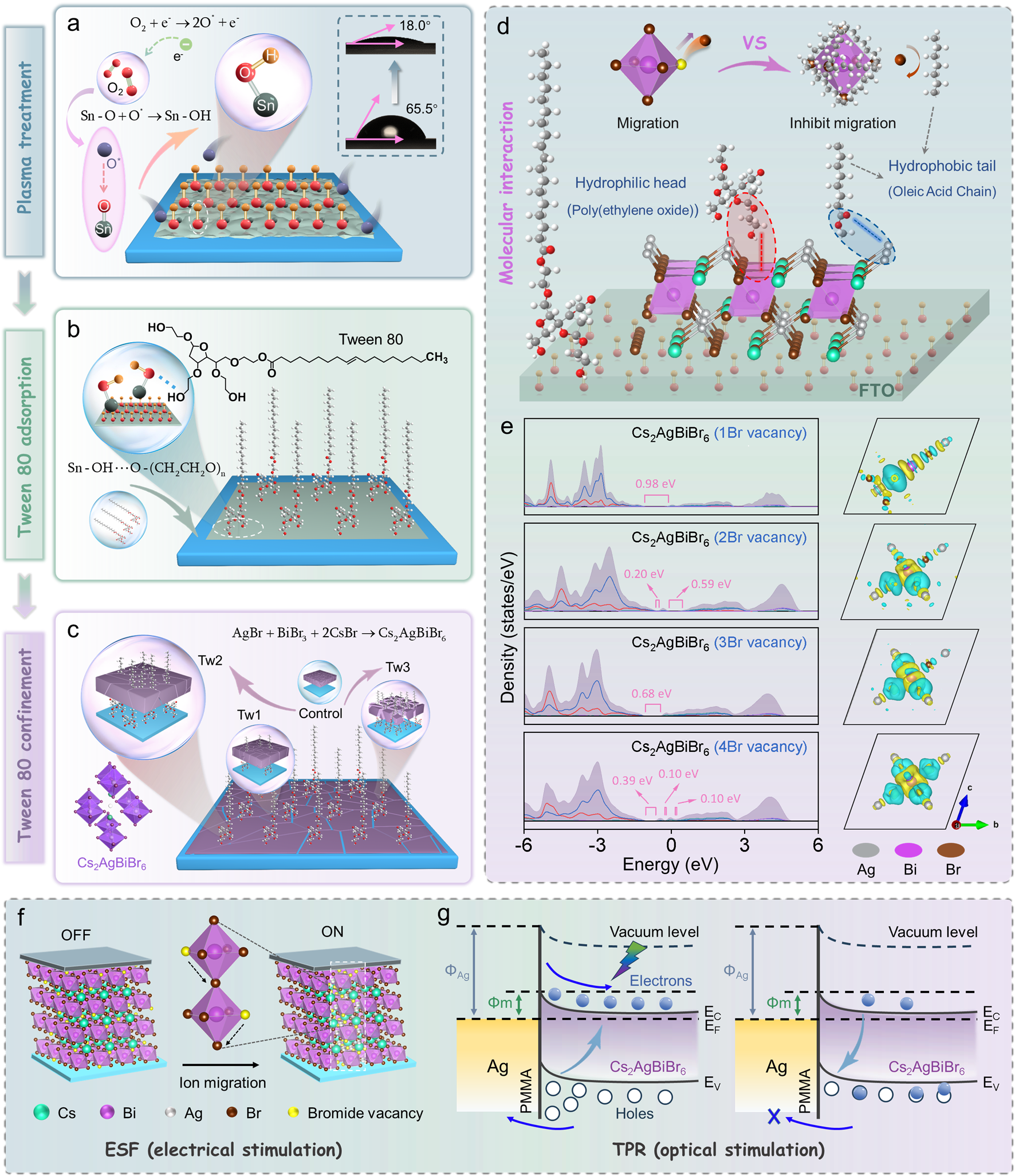 基于上述背景,西安交通大学前沿院邵金友、孙柏教授团队报道了一种利用双亲长链“Tween 80”封闭钙钛矿Cs2AgBiBr6成核的限制策略。借助原位表征技术和第一性原理计算,该研究团队创新的提出了一种特异性抑制溴空位形成的动力学模型。其中,Tween 80的疏水部分(油酸链+酯基)从源头上抑制了溴空位的形成,根据软硬酸碱理论,银离子和铋离子可以与酯氧原子形成稳定的配位键。这种配位有效地将金属阳离子“锁定”在八面体中心,减轻了热振动或晶格应变引起的配位崩塌,从而降低了溴离子脱附的驱动力。此外,Tween 80的亲水部分(PEO链)可以通过八面体桥接位点的偶极-阴离子相互作用锚定溴离子。通过计算得出PEO链中的单个C、H和O原子与钙钛矿八面体桥接位点相互作用时体系的形成能均为负值(Abs-C = -1.58 eV,Abs-H = -0.46 eV,Abs-O = -1.53 eV),表明这些原子吸附到钙钛矿晶体结构上是一个热力学自发过程。PEO链在晶体表面吸附产生空间位阻,调节结晶速率,这为溴离子扩散到有序晶格位点提供了充足时间,进一步抑制了溴空位的形成。