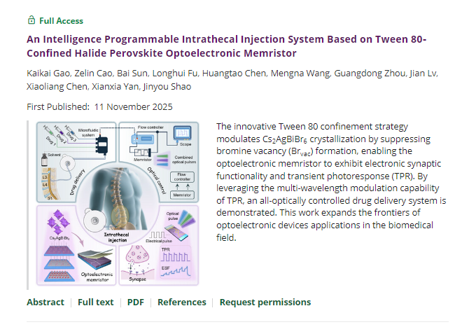 通过精确控制Tween 80封闭程度,研究团队制备了大晶粒尺寸、无针孔、高结晶度、超高光致发光强度的Cs2AgBiBr6薄膜。为了评估其在光电子器件中的性能表现,研究团队通过垂直堆叠工艺制备了钙钛矿基光电忆阻器,该忆阻器兼具电子突触功能(ESF)和瞬态光响应(TPR)特性。利用电刺激下的ESF在MNIST识别任务中达到了91%的识别准确率。在光刺激下,它展示出20 ms响应时间的TPR、931.7 s的超长耐久性,以及在5 Hz下超103次循环定性。在应用方面,所制备光电忆阻器通过多波长光脉冲编程实现了全光控写入和擦除,能够完成复杂的全光控图像处理任务。此外,作者们特别展示了一种基于光电忆阻器的全光控鞘内药物注射系统,最高可支持六种特定的药物释放策略。该工作为调控钙钛矿成核提供了可参考的封闭工艺和理论支持,也展示了光电忆阻器在全光控鞘内药物注射系统中的应用前景。