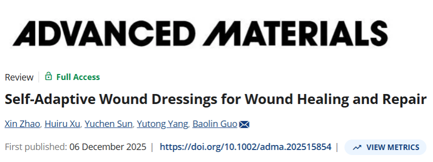 近日,西安交通大学前沿科学技术研究院、金属材料强度全国重点实验室郭保林教授团队应《先进材料》(Advanced Materials)期刊邀请,发表题为《自适应创面敷料用于伤口愈合与修复》(Self-Adaptive Wound Dressings for Wound Healing and Repair)的长篇综述论文。论文围绕伤口愈合的生物学基础与复杂微环境,系统总结了自适应敷料的定义、关键性能、设计策略与代表性材料体系,旨在为下一代智能化、个性化和可转化的创面修复提供系统化设计框架与实践路线。