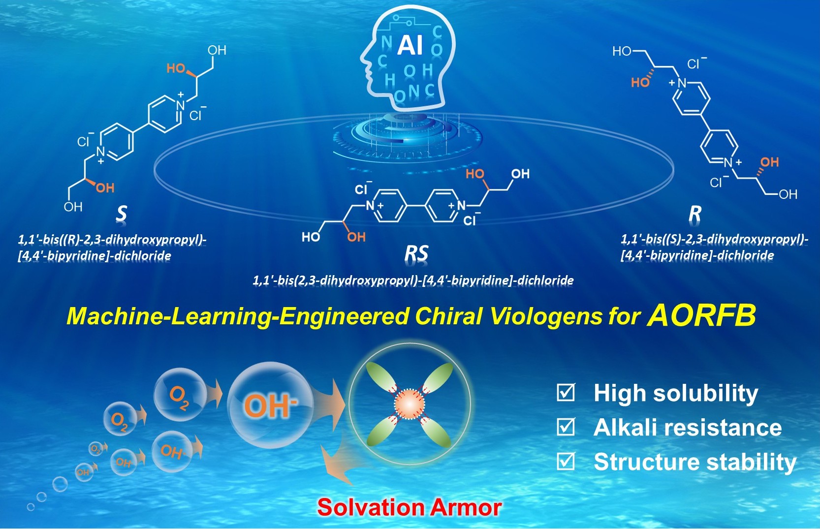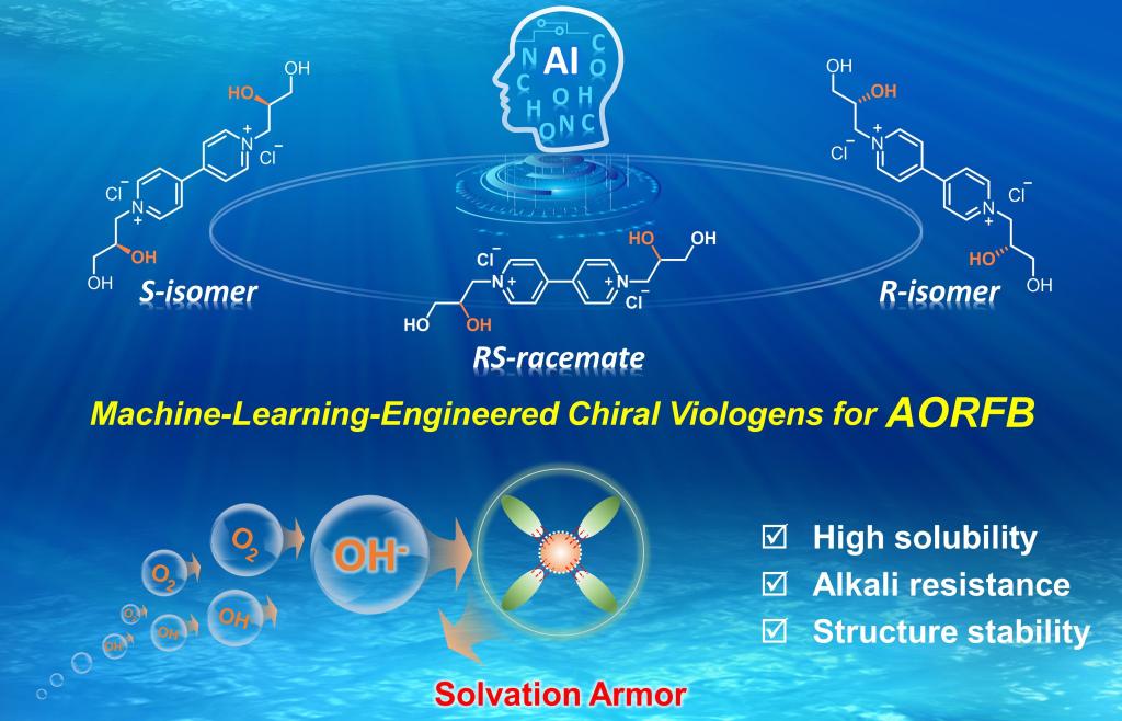 针对上述问题,西安交通大学前沿院何刚教授课题组在前期工作基础上,率先利用大型语言模型(LLMs)的机器学习策略,经过1300多项AORFB研究训练,用于预测具有邻位二羟基基团的手性紫精。这种键合网络形成了一种动态、pH适应性的“溶剂化装甲”,稳定了紫精母体结构。R-/S-对映体的溶解度比RS-外消旋体高1.66倍。分子模拟和原位光谱证实,二羟基基团通过溶剂化结构保护反应性C-N键,从而增强紫精在pH=11范围内的稳定性。基于此,对称电池(1M)在3652次循环中实现了99.42%的容量保留率。1 M R基AORFB在533次循环中保持100%容量,优于[(NPr)2V]Cl4(94.92%)和磺酸改性紫精[(SPr)2V](65.49%)。此外,kg-Ah级手性紫精的规模合成以及电堆测试(2M)得到成功验证,证明手性紫精具有极大的产业化潜力。