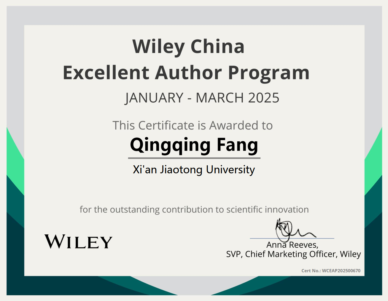 面向糖尿病慢性伤口治疗这一重大临床需求,方青青所在课题组立足学科交叉,致力于开发新一代非抗生素智能抗菌材料,构建了化学调控与物理治疗相辅相成的智能水凝胶敷料体系,实现安全高效的抗菌治疗。她与课题组成员的研究成果已发表于材料领域顶级期刊Advanced Materials,并获中国高贡献作者奖。作为主要成员参与多项国家级、省部级课题,荣获国家级二等奖,方青青用创新与坚持,践行着“学术报国”的初心。